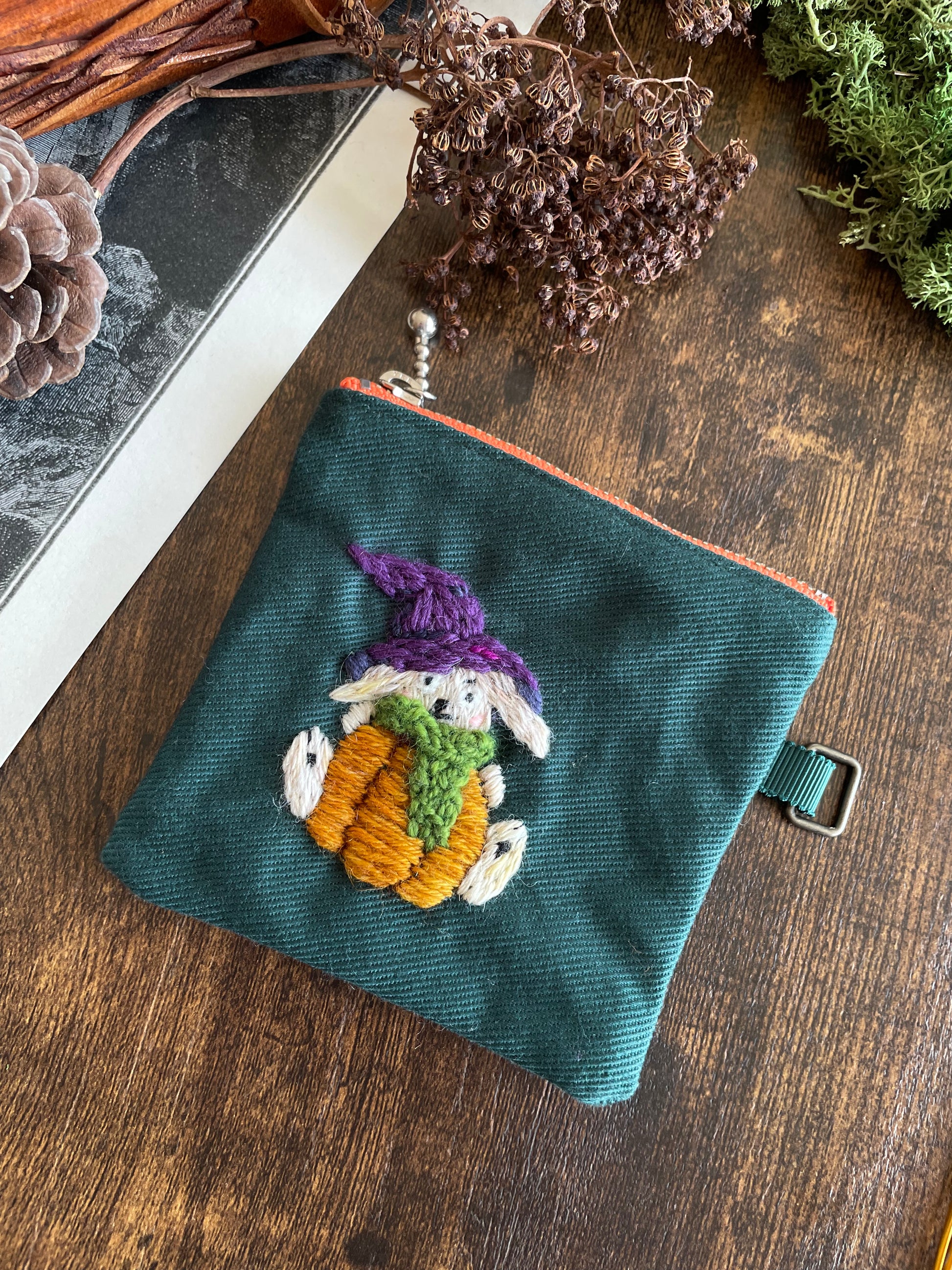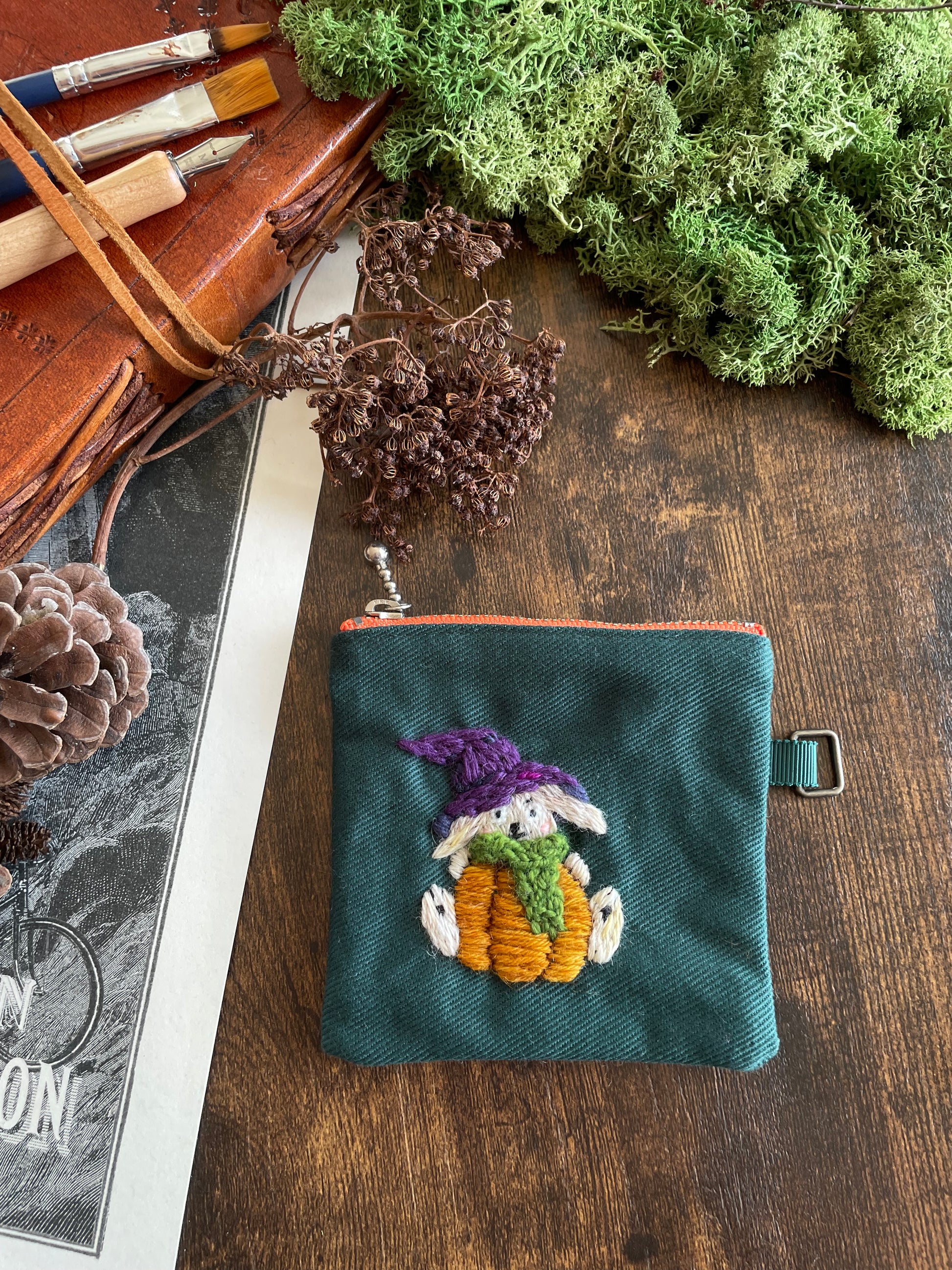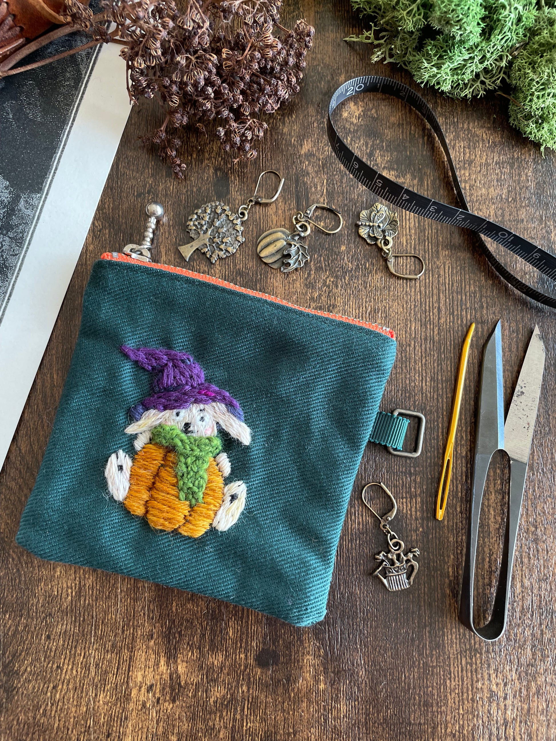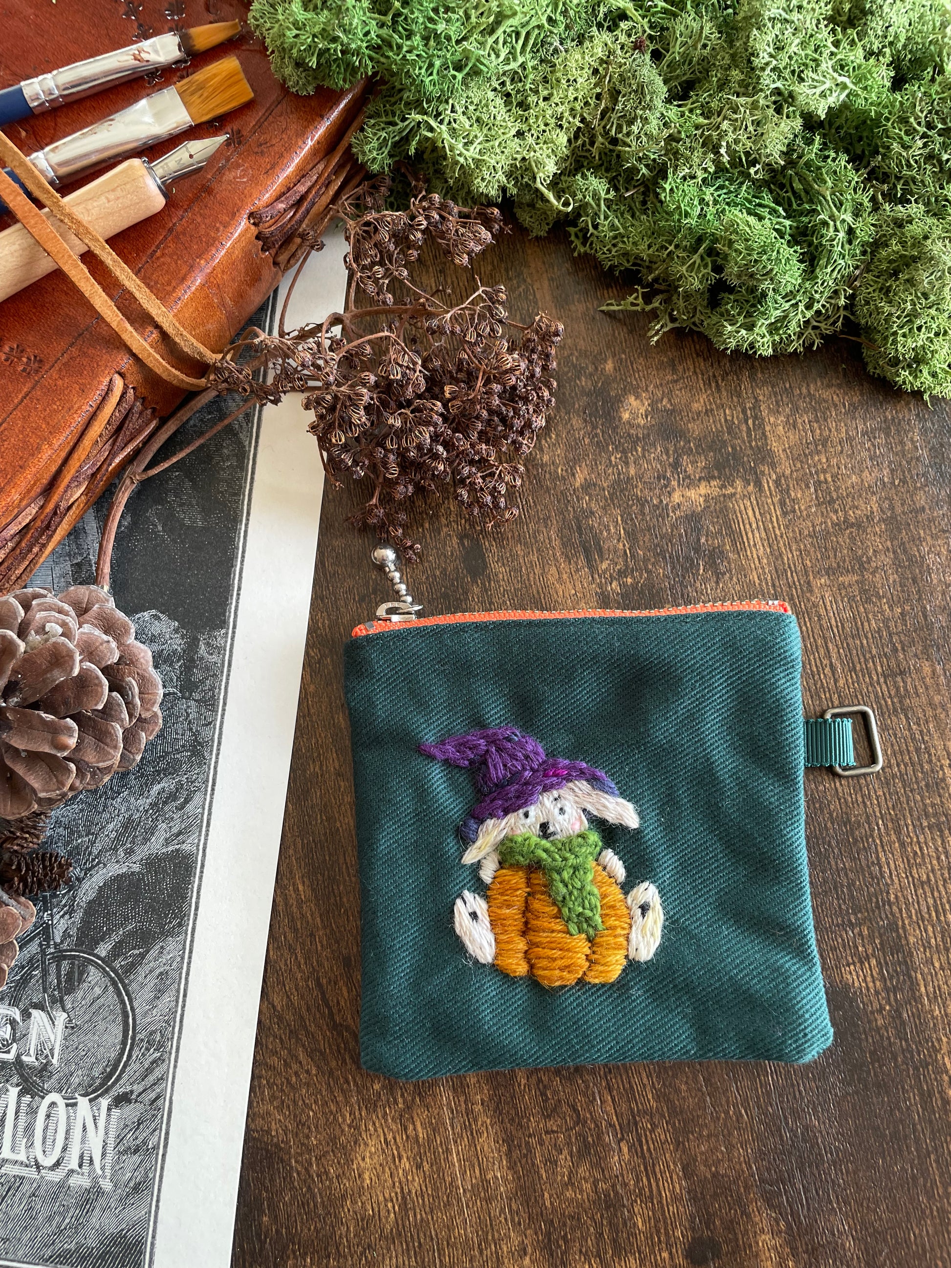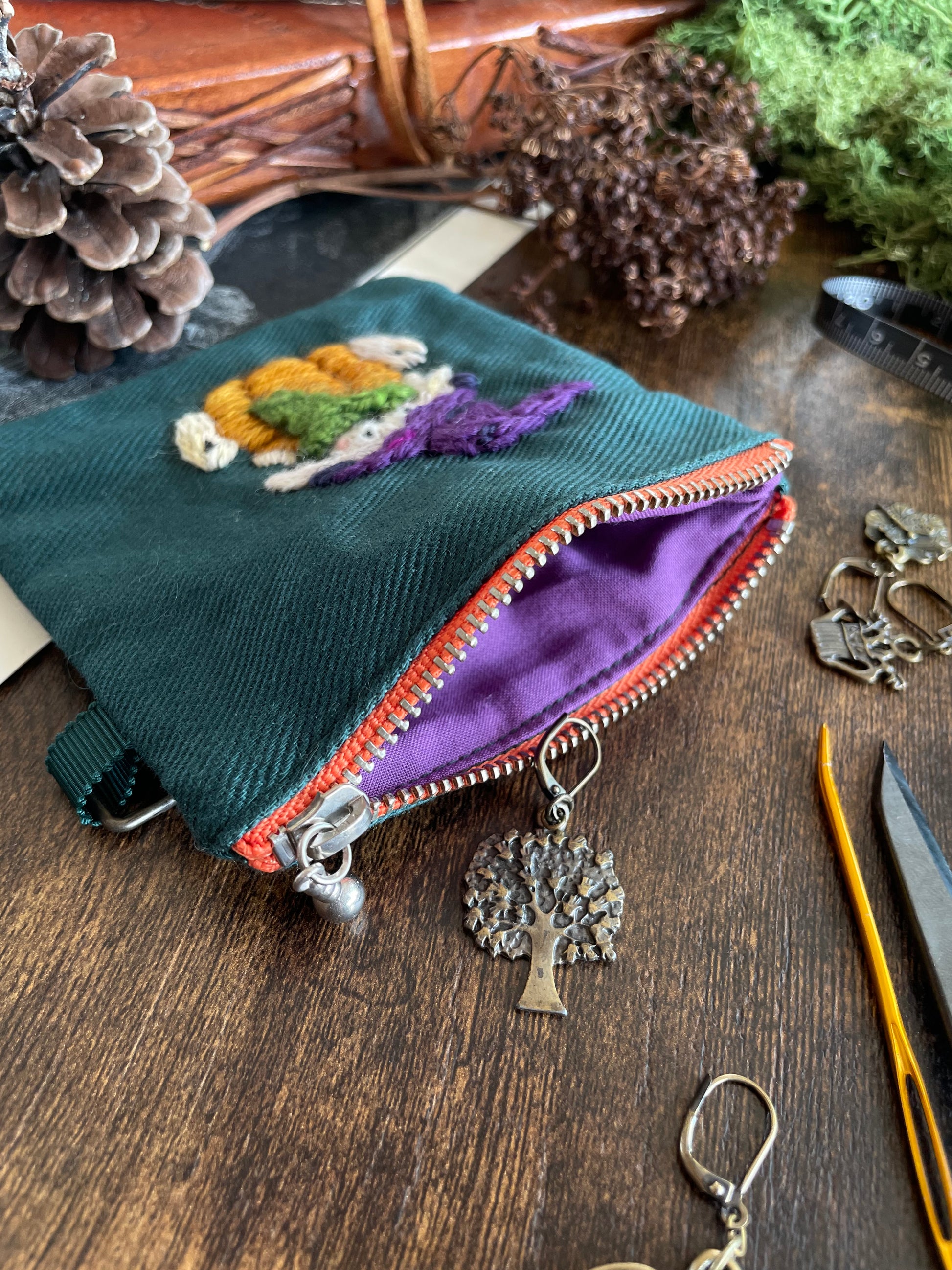 The pouches are embroidered with wool thread on cotton twill. The metal parts are stainless steel.