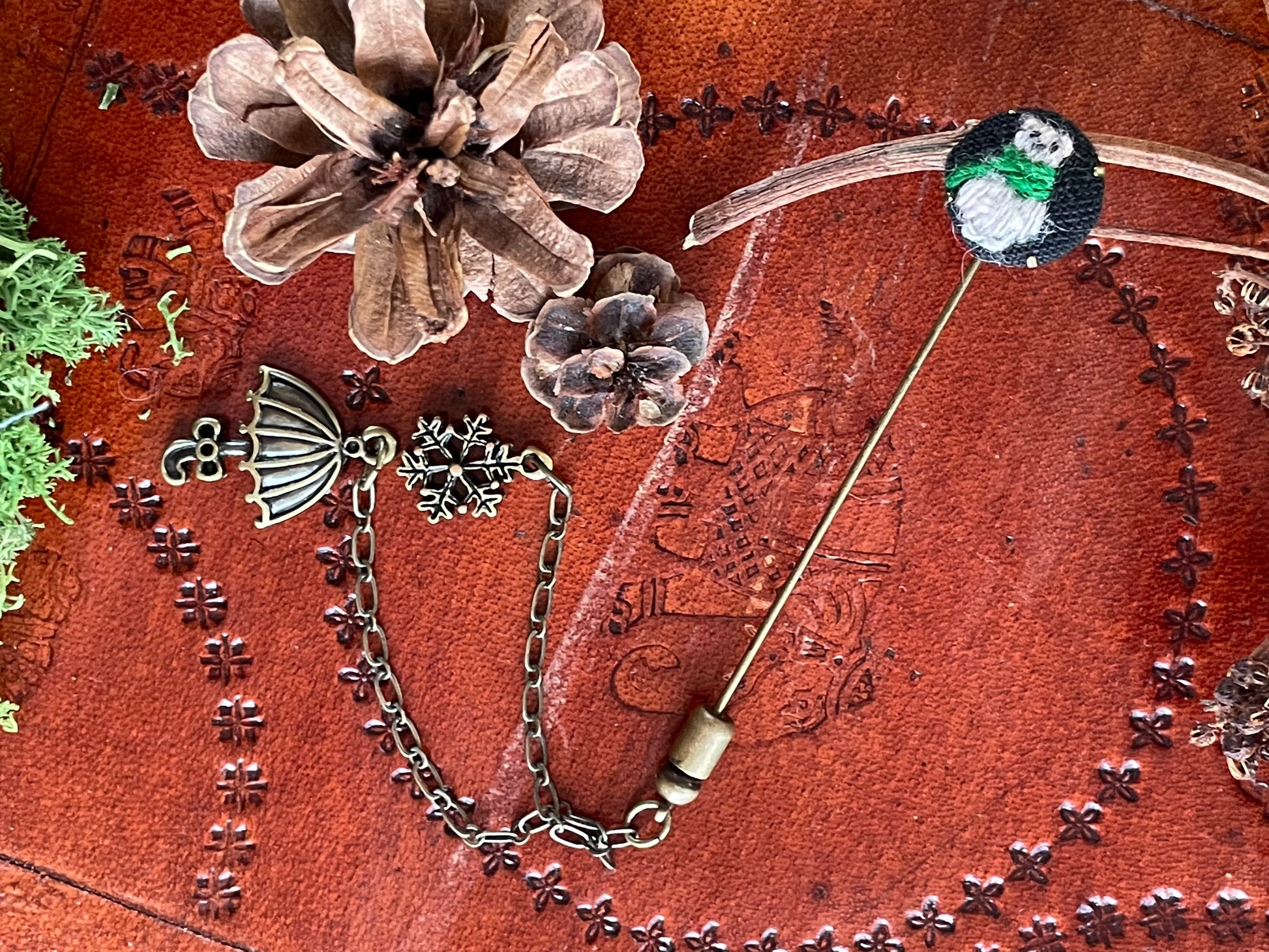 The shawl pin is embroidered with wool thread on cotton/linen fabric. The metal parts are brass.