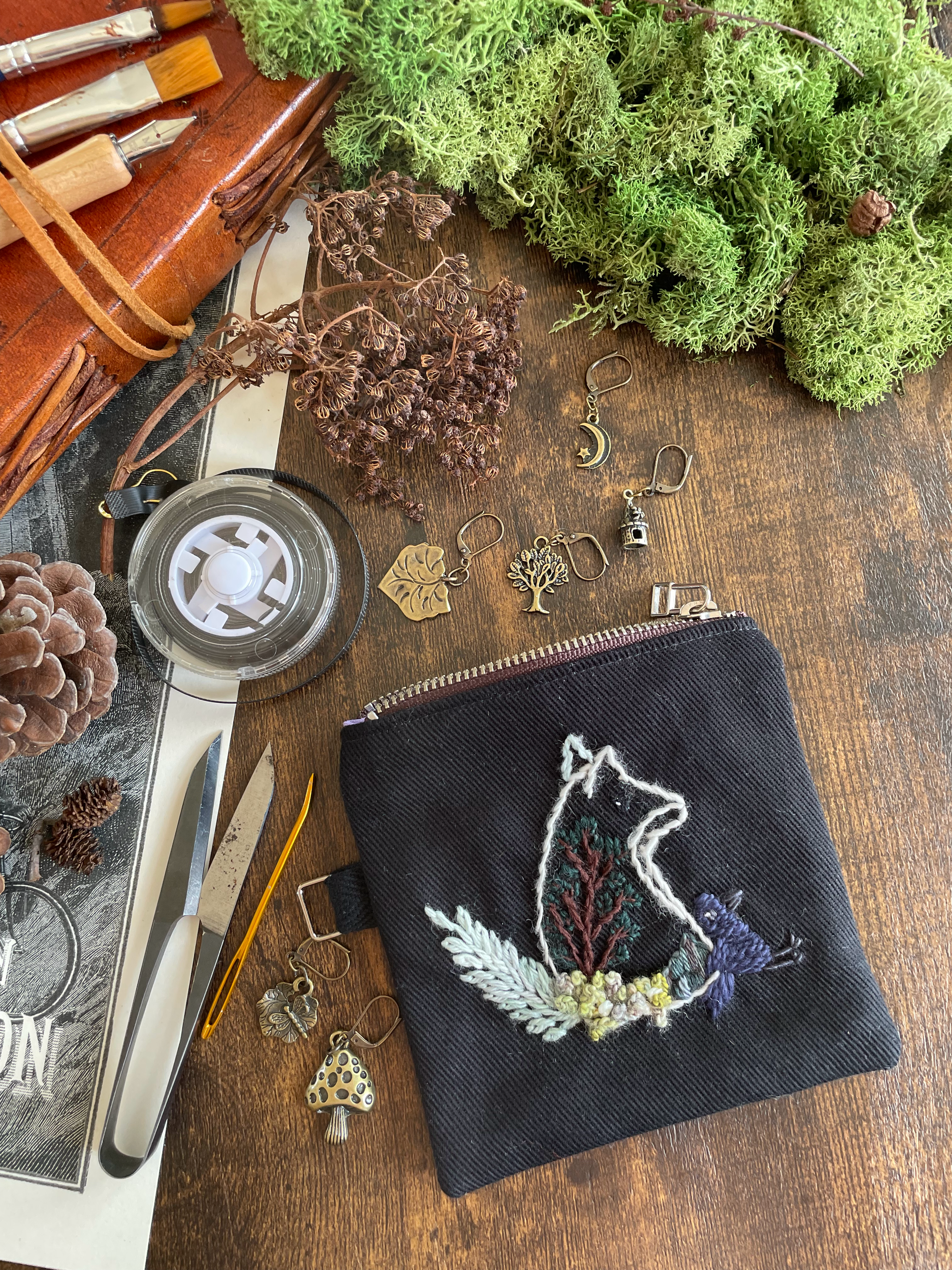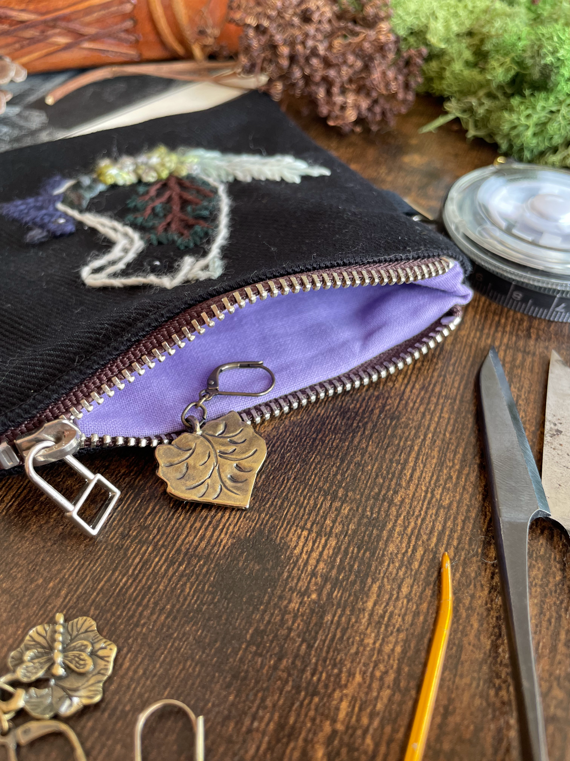 The pouches are embroidered with wool thread on cotton twill. The metal parts are nickel.