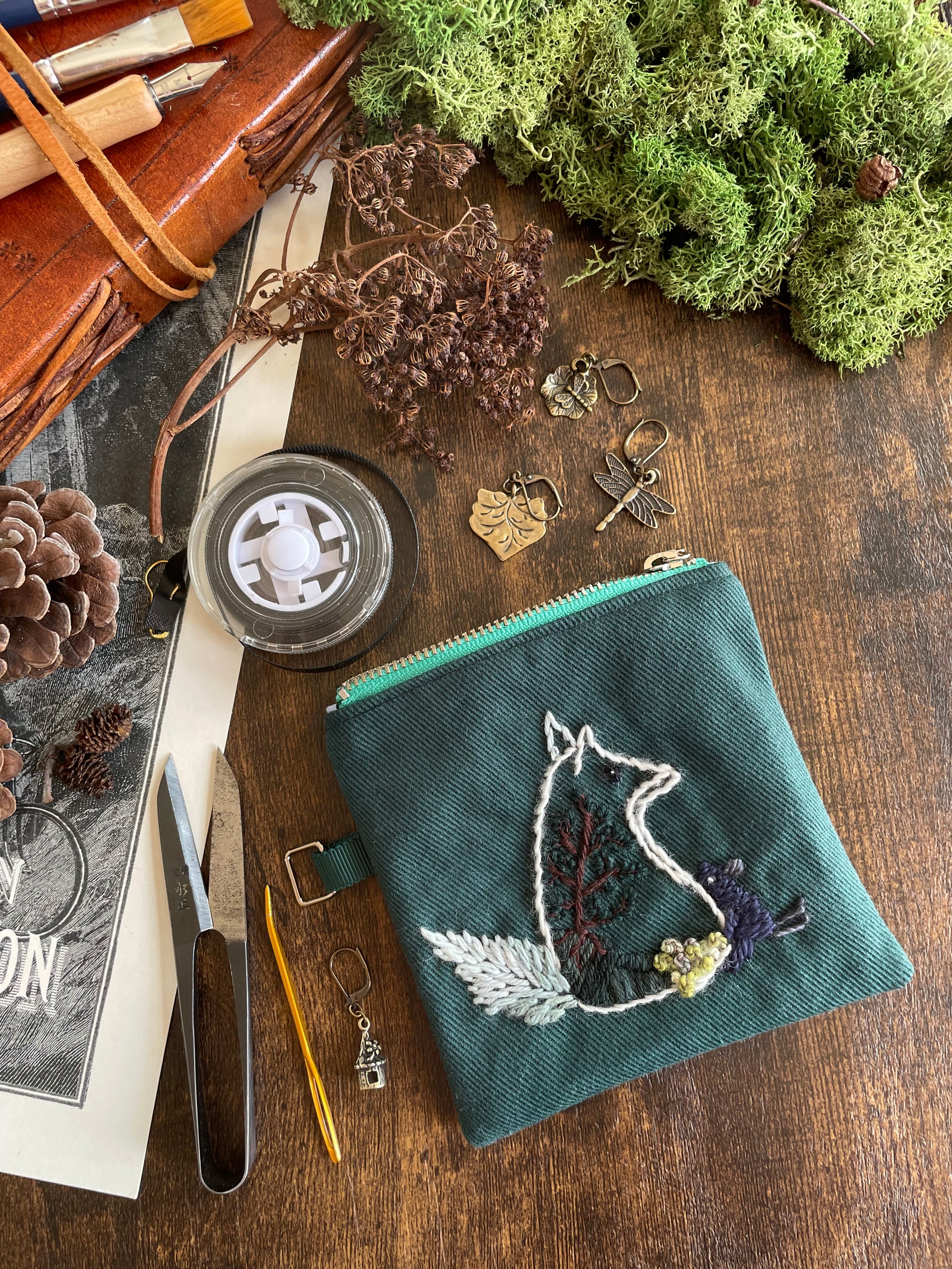 The pouches are embroidered with wool thread on cotton twill. The metal parts are nickel.
