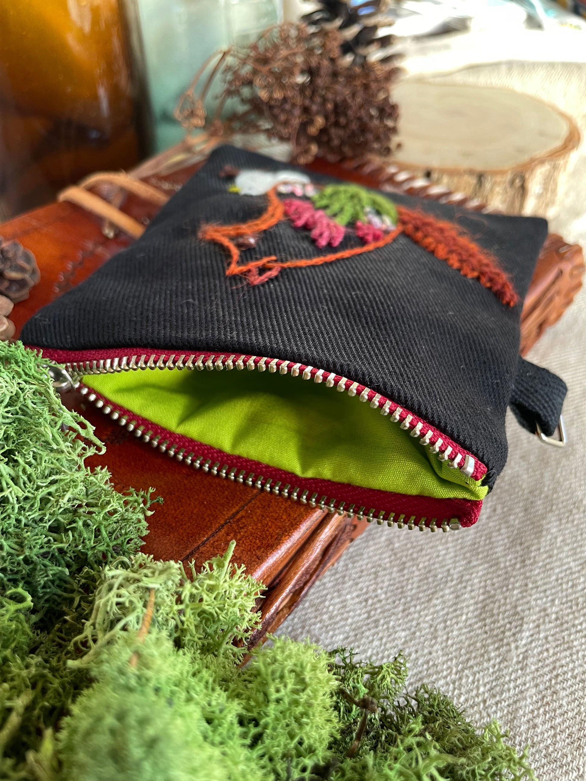 The pouches are embroidered with wool thread on cotton twill. The metal parts are stainless steel.