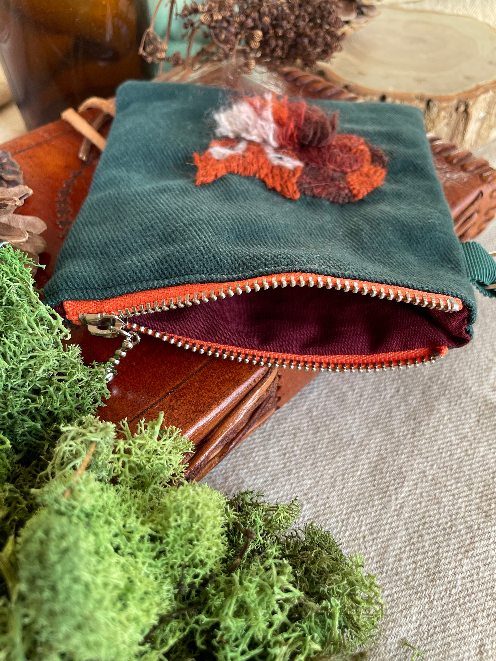 The pouches are embroidered with wool thread on cotton twill. The metal parts are stainless steel.