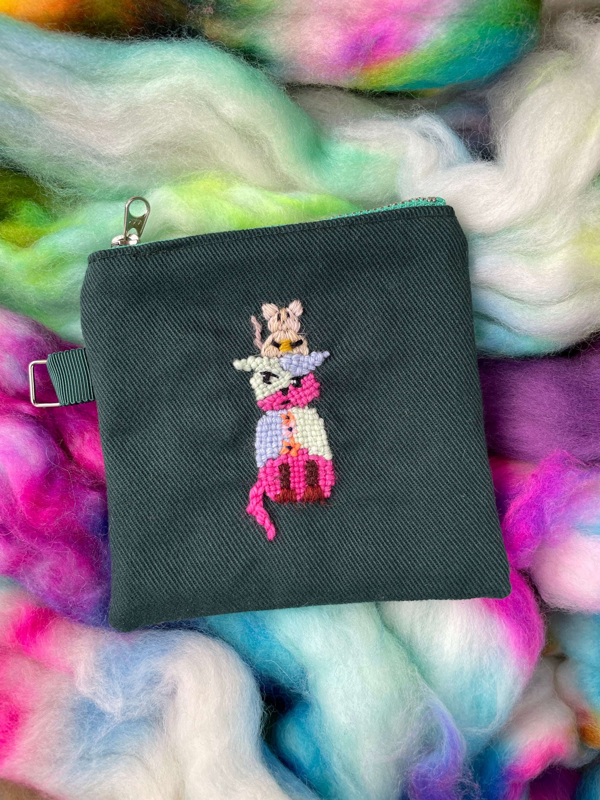 The pouches are embroidered with wool thread on cotton twill. The metal parts are brass.