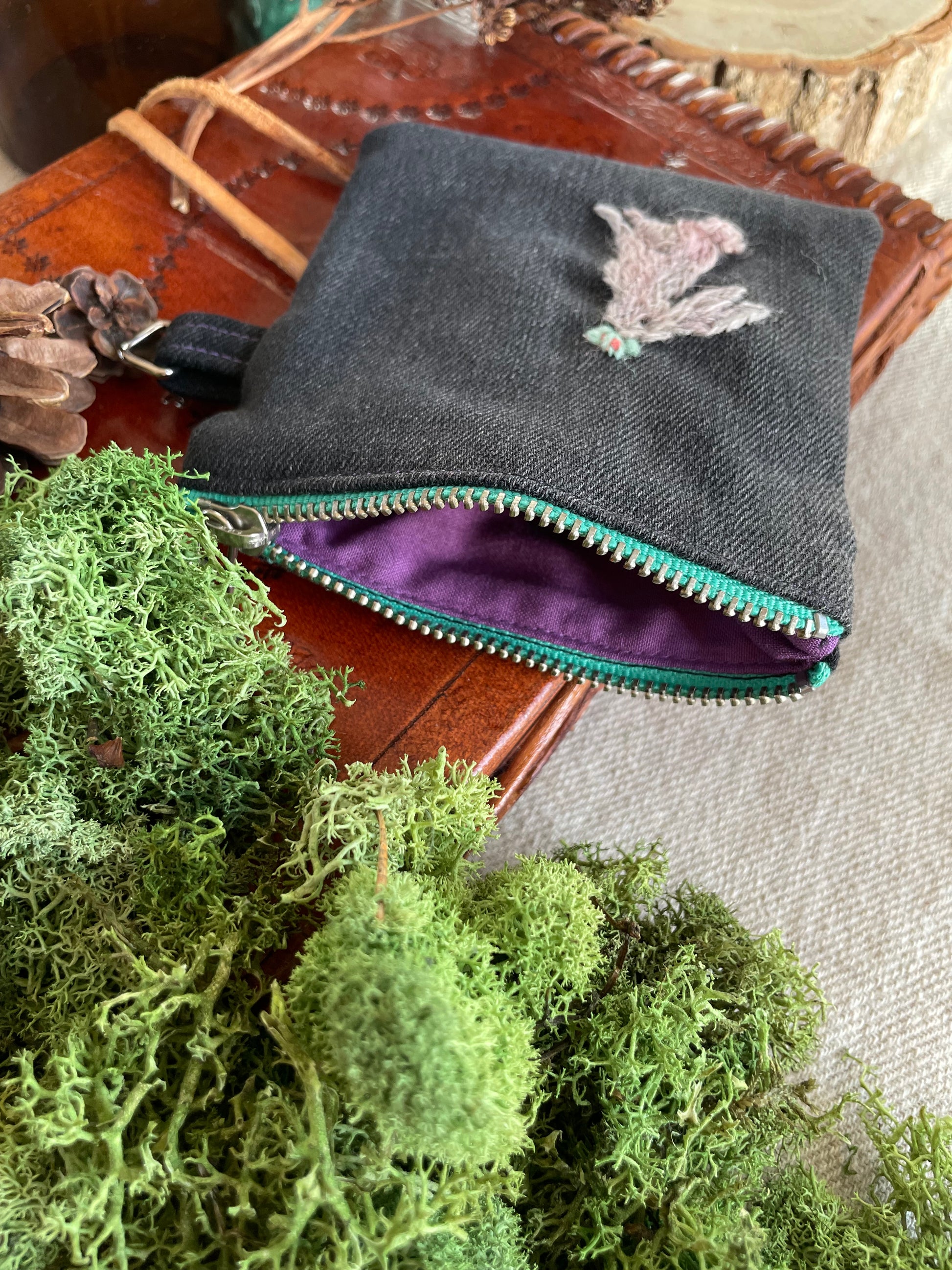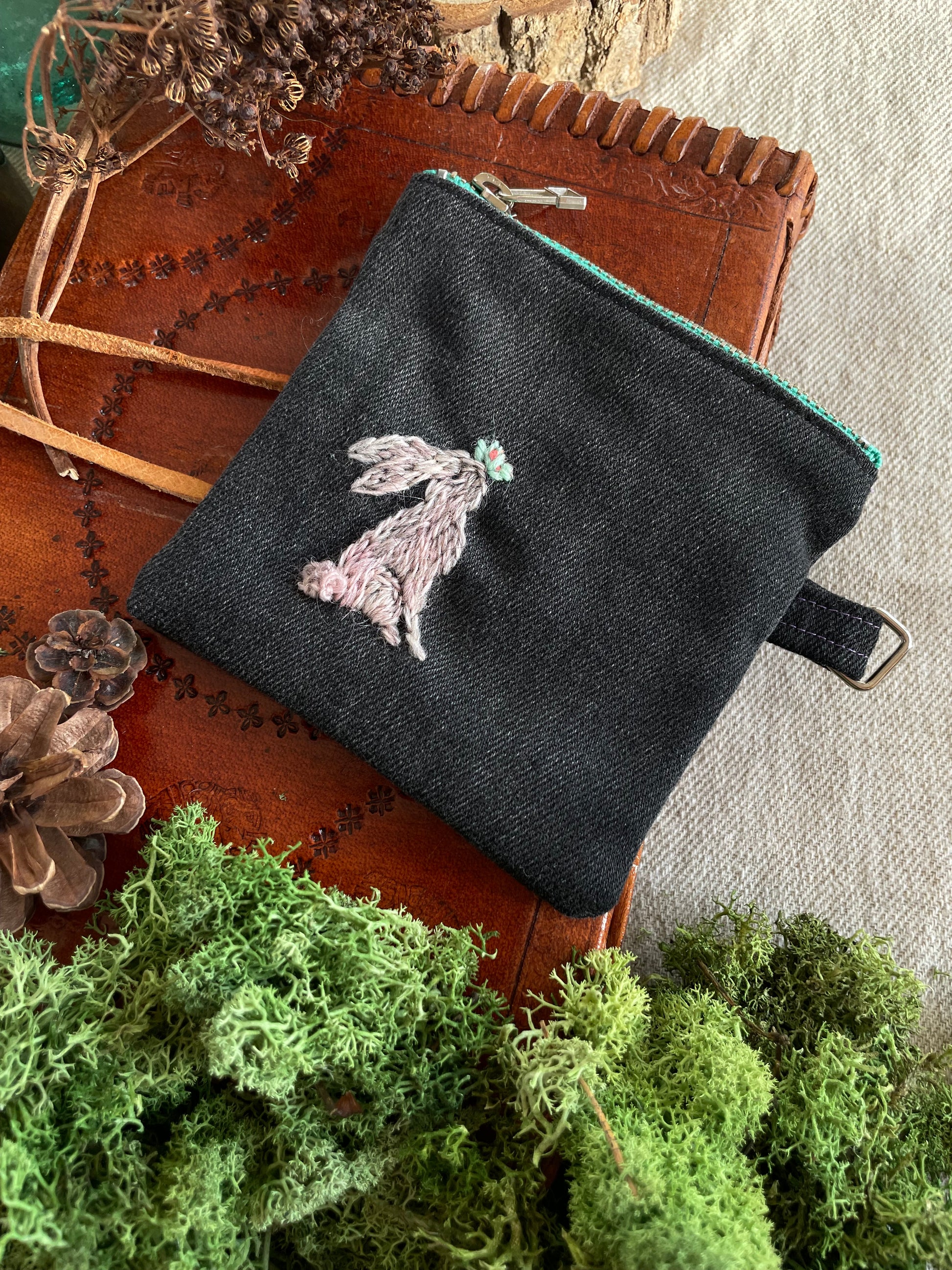 The pouches are embroidered with wool thread on cotton twill. The metal parts are nickel.