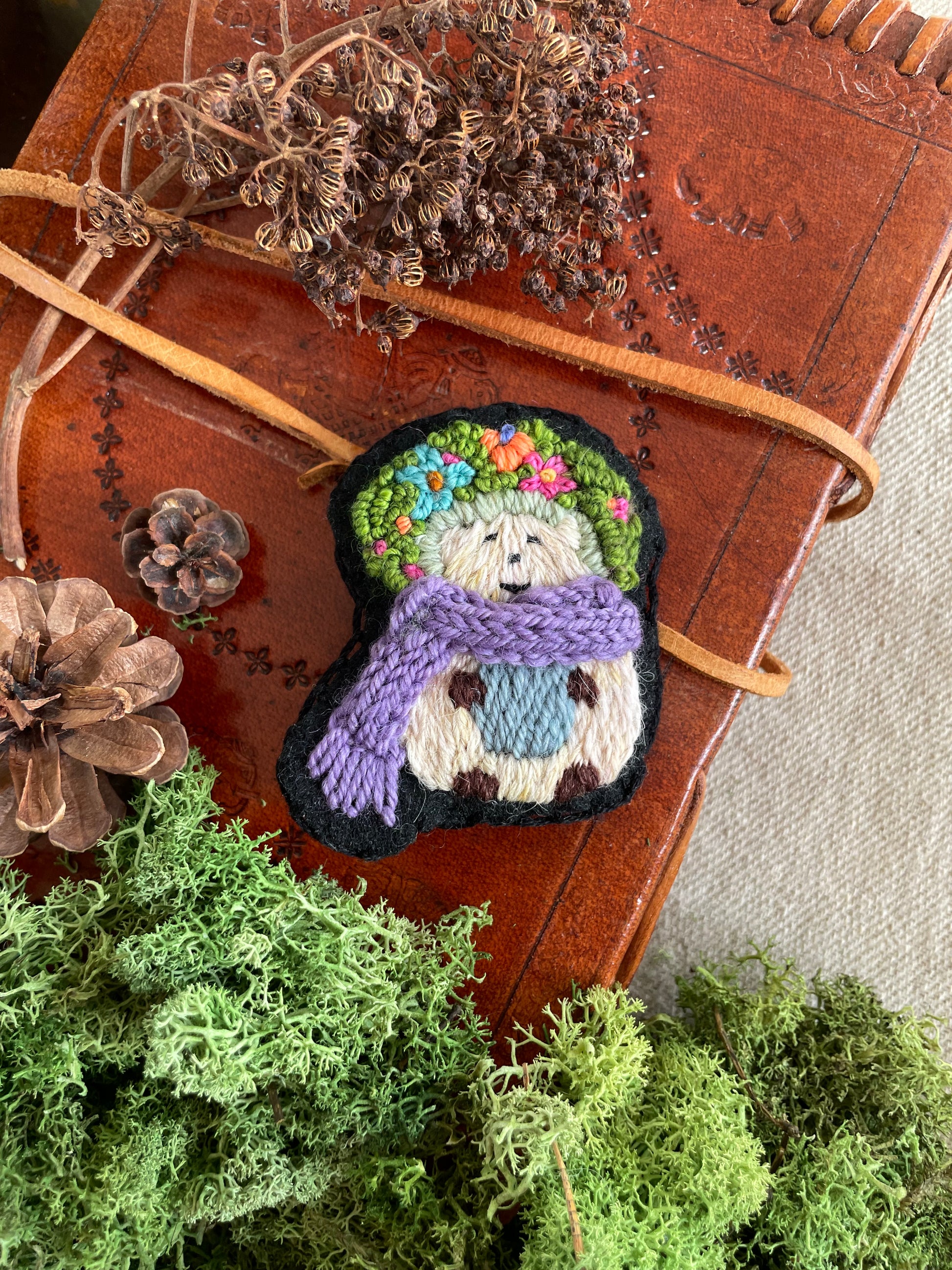 The brooch is embroidered with wool thread on cotton/linen fabric. The metal parts are brass.